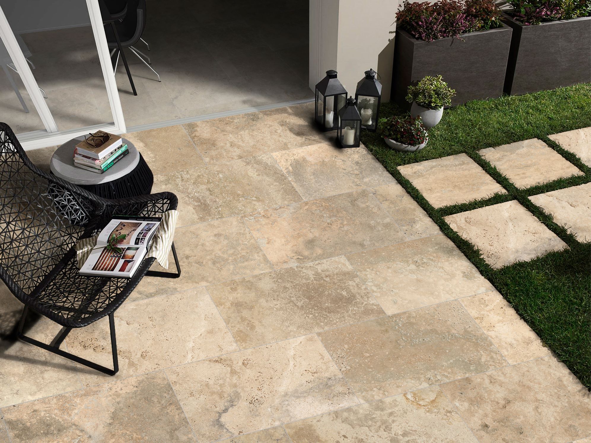 Le carrelage CORTONE CROSSCUT extérieur associe un aspect pierre naturel à des bords festonnés pour un rendu à la fois rustique et moderne.